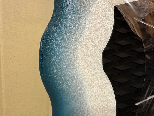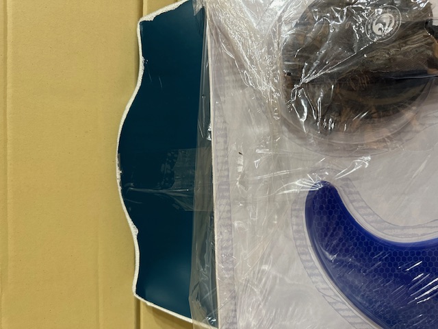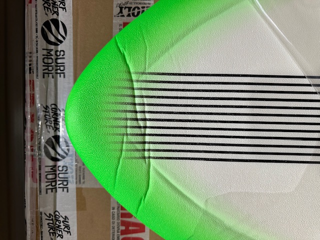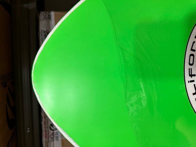 Leggero danneggiamento durante il trasporto con schiacciamento sul nose e piccolissimo schiacciamento sul tail, del tutto irrilevante per l'uso convenuto. Il bottom è rimasto intatto mentre lo schiacciamento ha lasciato quale piega visibile sul deck. Danno puramente estetico.