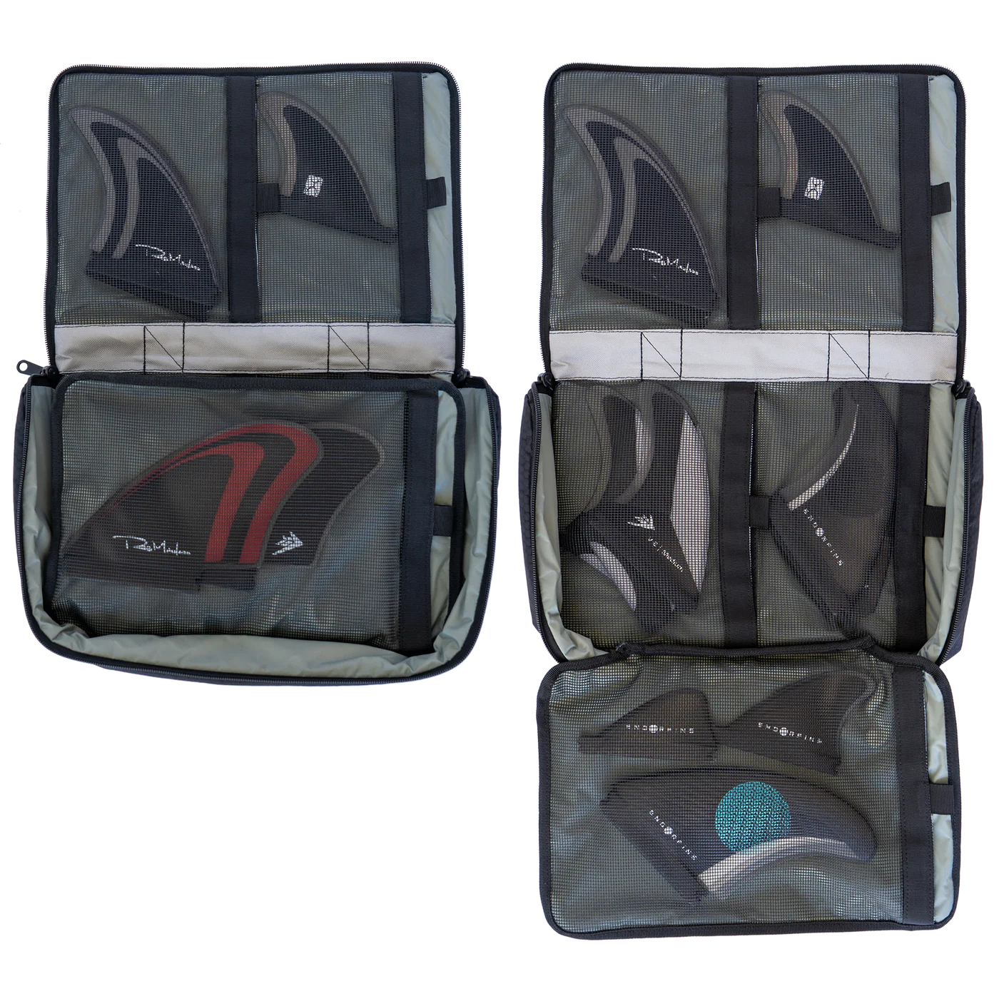 Quattro scomparti più piccoli: scomparti dedicati per ospitare fino a quattro pinne shortboard, mantenendole organizzate e facilmente accessibili.