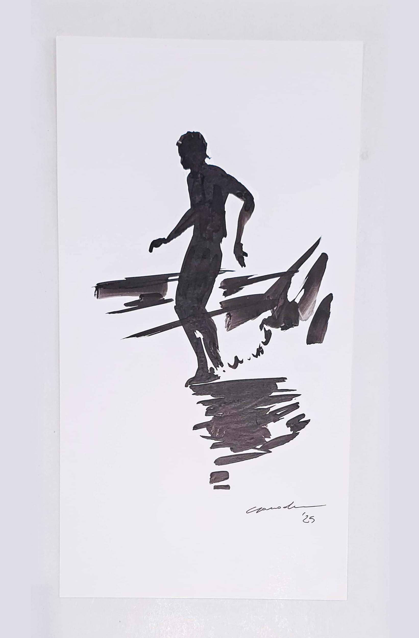 Su questa articolazione, l’artista innesta la figura umana a brevi tratti, crea così un’emozione viva, determinante. Il cenno incisivo dell’uomo, in equilibrio su una tavola fra le onde, anima ed emoziona l’osservatore per quel tocco rapido di tinte poste a pennello, senza linee di contorno.