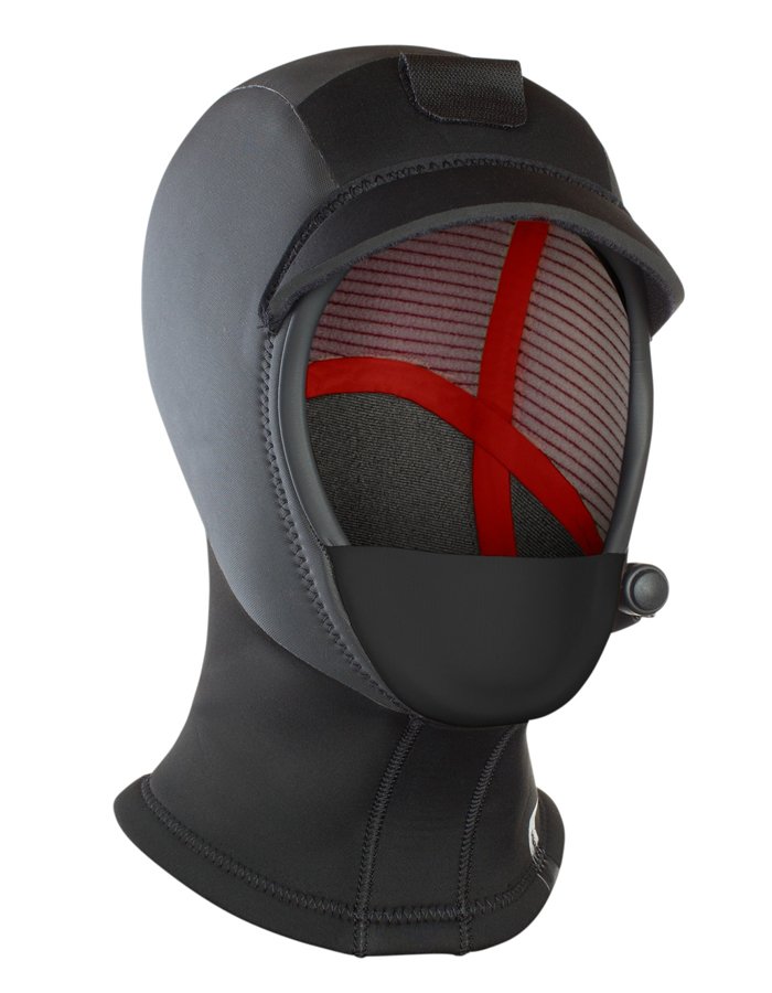 La costruzione in Plasma Plush 2.0, Skin Hood Rivestimento interno morbidissimo con cuciture nastrate per aumentare la ritenzione di calore e benessere. Neoprene Visor, Elastic drawcord - Cordlock 80% Neoprene / 20% Nylon