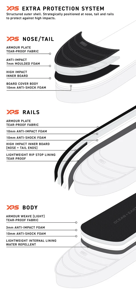 Abbraccia il futuro della protezione delle tavole da surf con i nostri innovativi sistemi di protezione APEX, 'XPS-IPS', che incorporano un guscio esterno strutturato (XPS) per una difesa ad alto impatto e cuscinetti ammortizzanti posizionati internamente e cinghie di compressione (IPS) progettati per cullare e proteggere le tue tavole, instillando una fiducia che durerà una vita.
