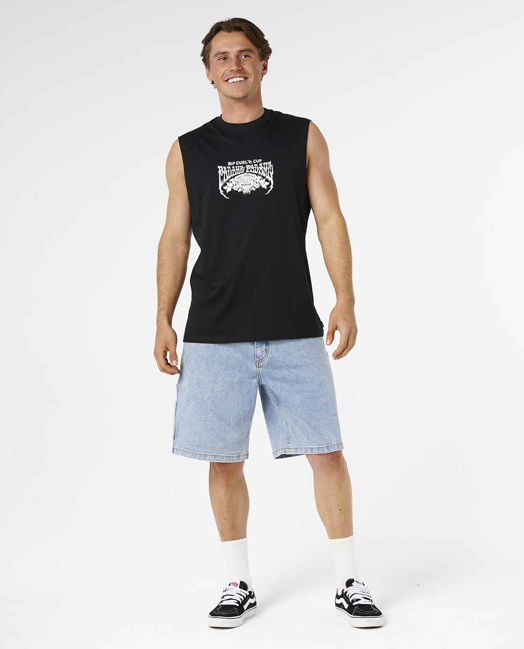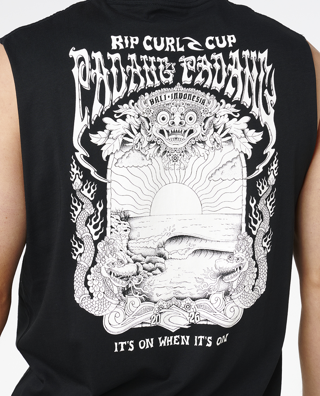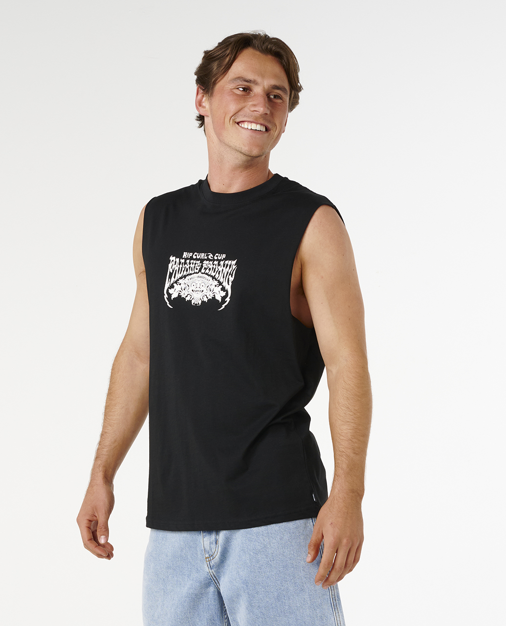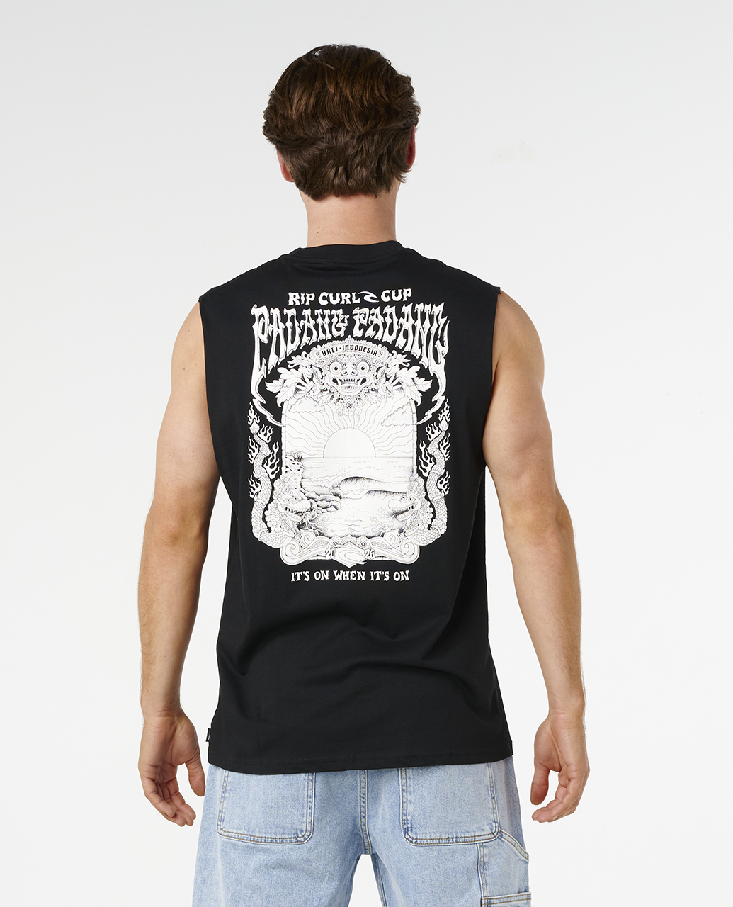 RIP CURL PADANG CUP 26 MUSCLE TEE CANOTTA BLACK Caratteristiche: jersey di cotone 160 g/m², vestibilità ampia, stampa frontale e posteriore, etichetta tessuta.