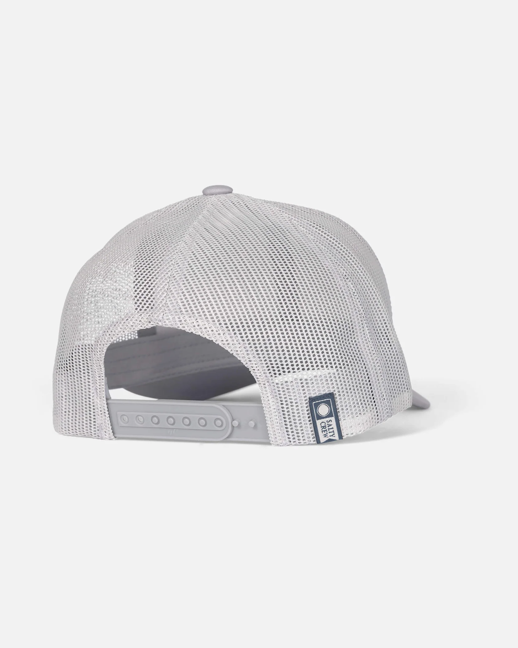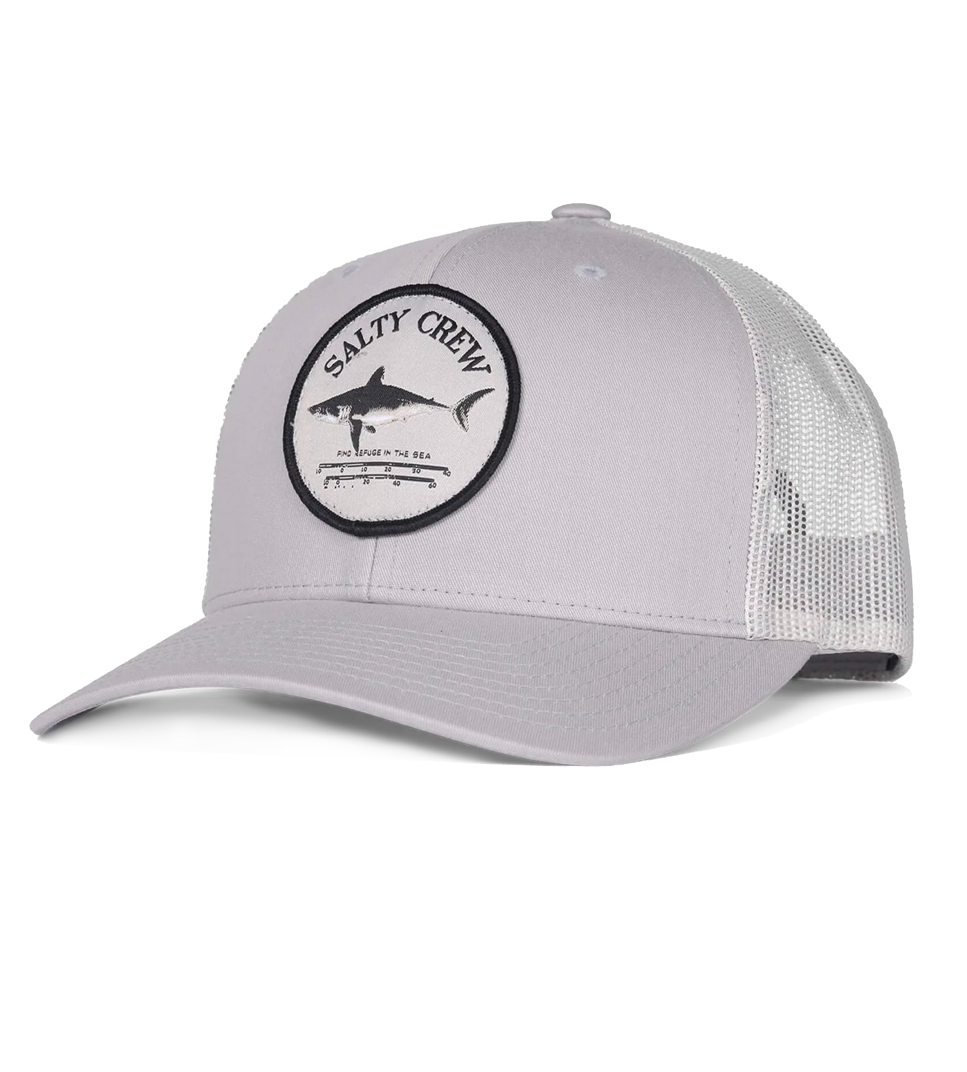 SALTY CREW BRUCE RETRO TRUCKER CAPPELLINO SILVER 65% polyester/35% cotton 6-panel water-resistant hat Low crown height and permacurve visor Plastic snapback adjuster Woven patch at front crown Salty Crew clamp label at back One Size