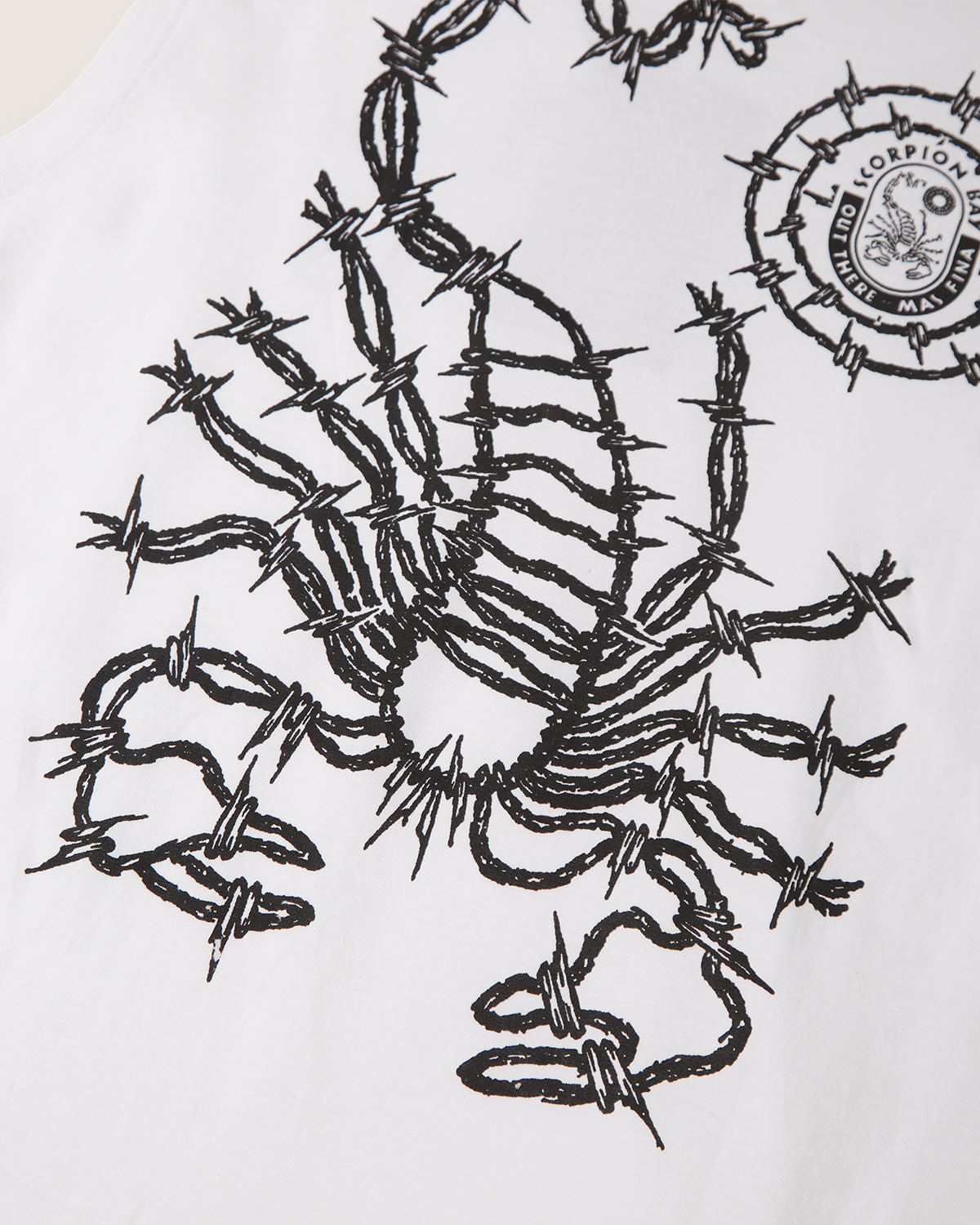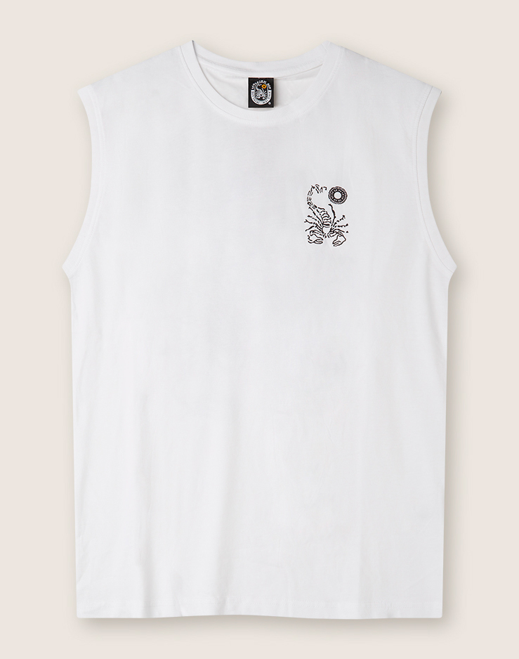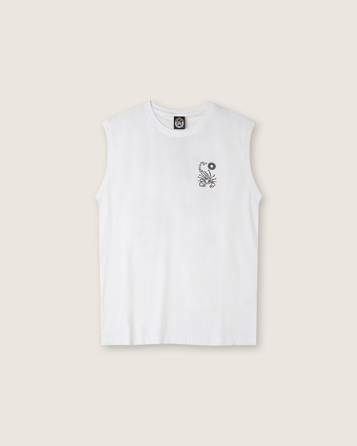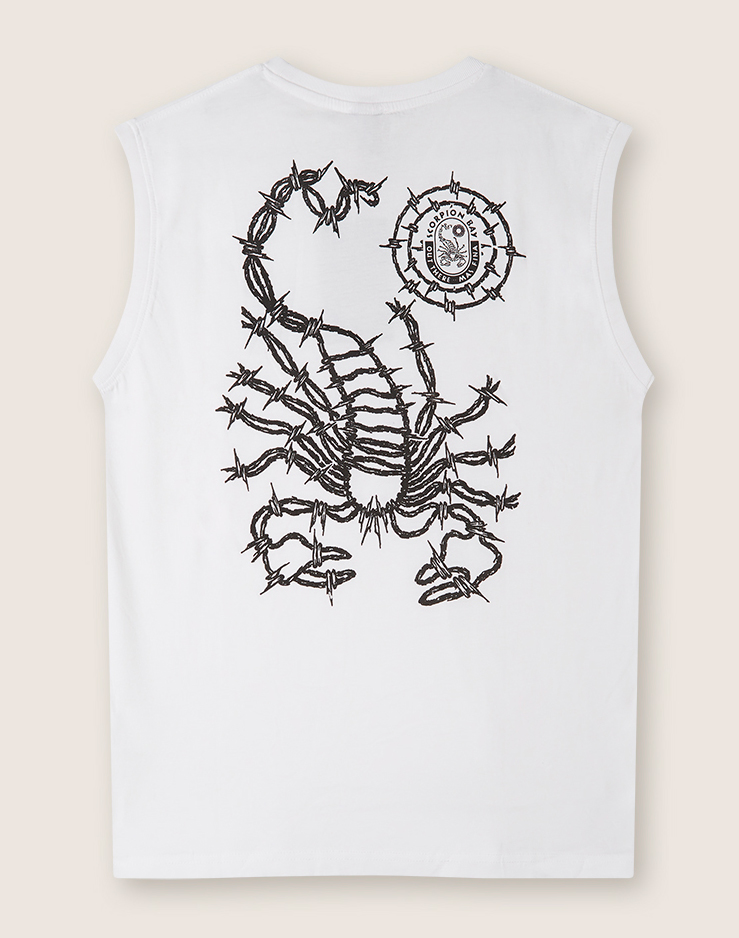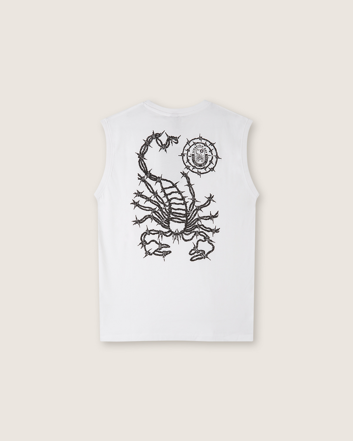 T-shirt senza maniche stampata uomo color bianco. Stampa grafica scorpione spinato sul retro e a petto.