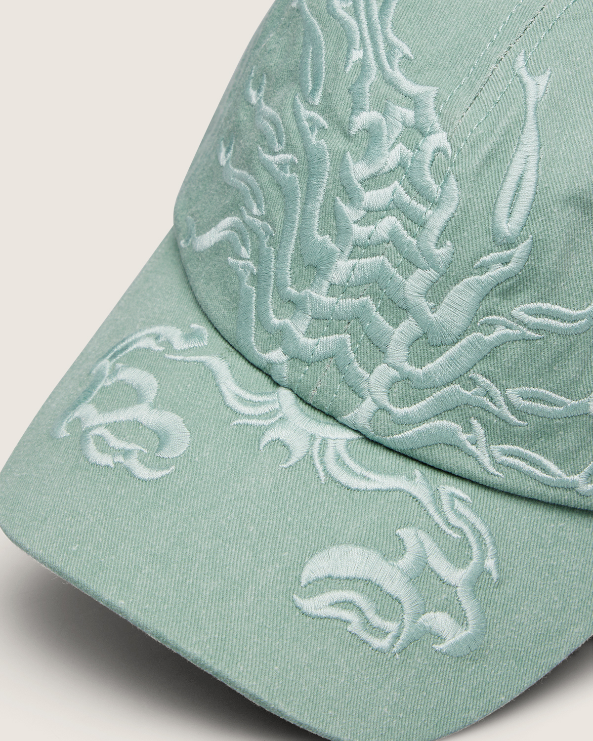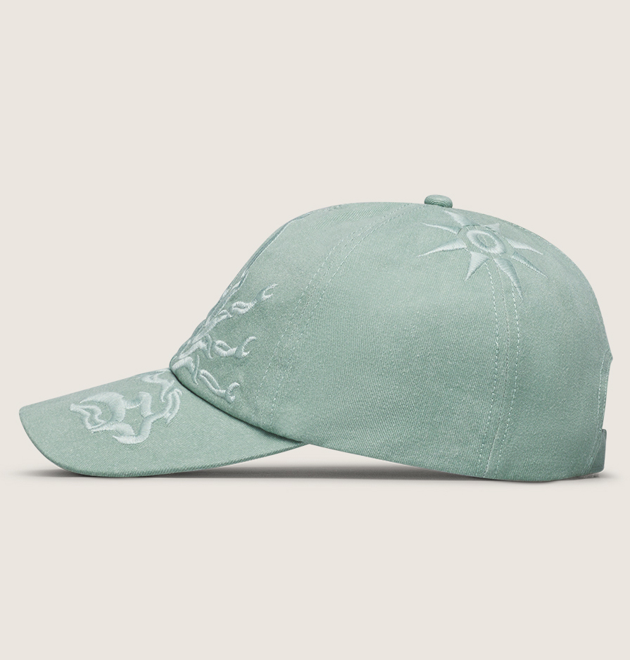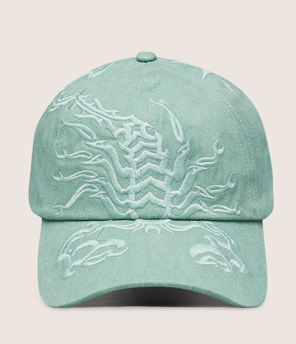 Cappello baseball verde iconico con ricamo scorpione verde. Chiusura in velcro. Visiera curva. Realizzato in twill di cotone.