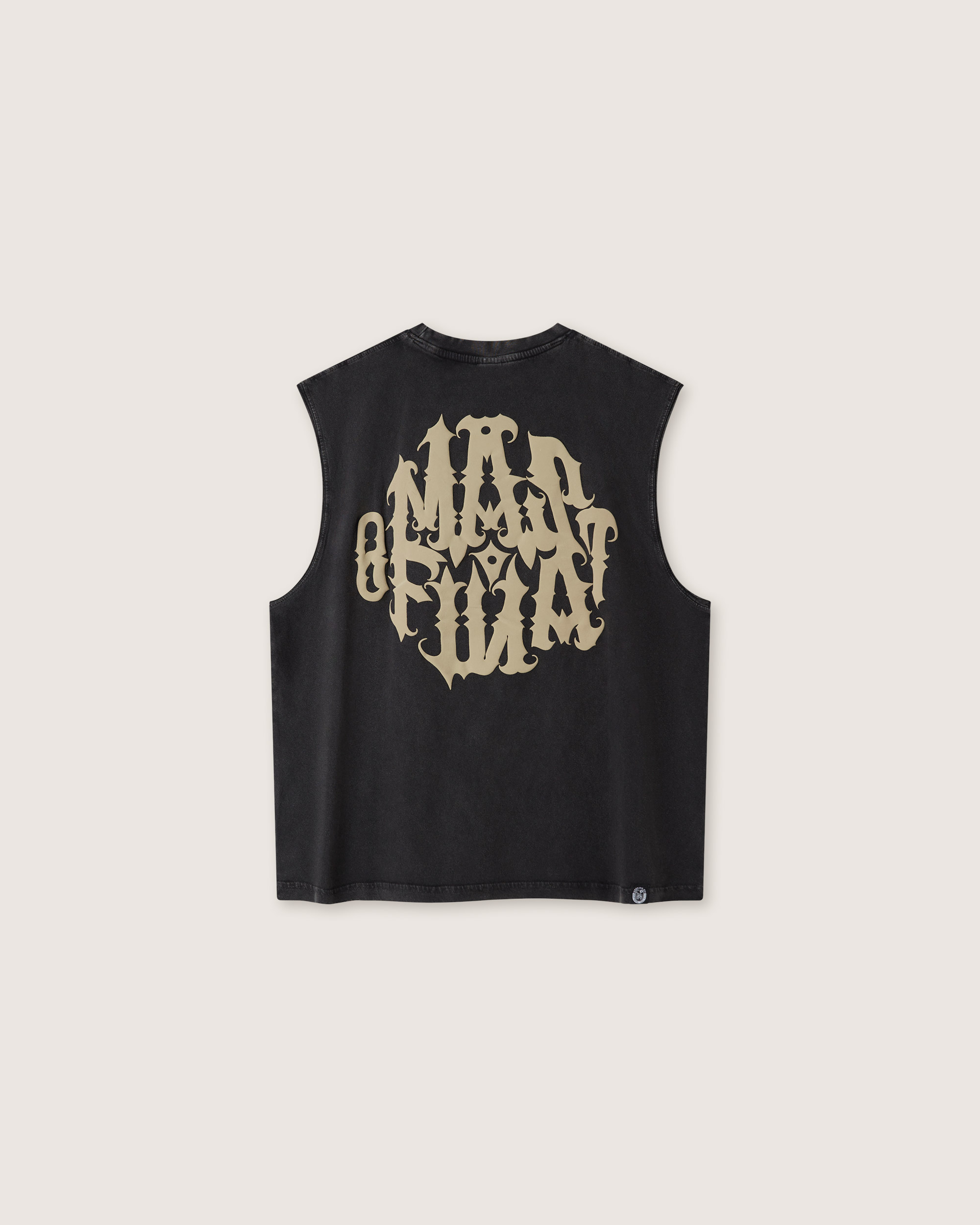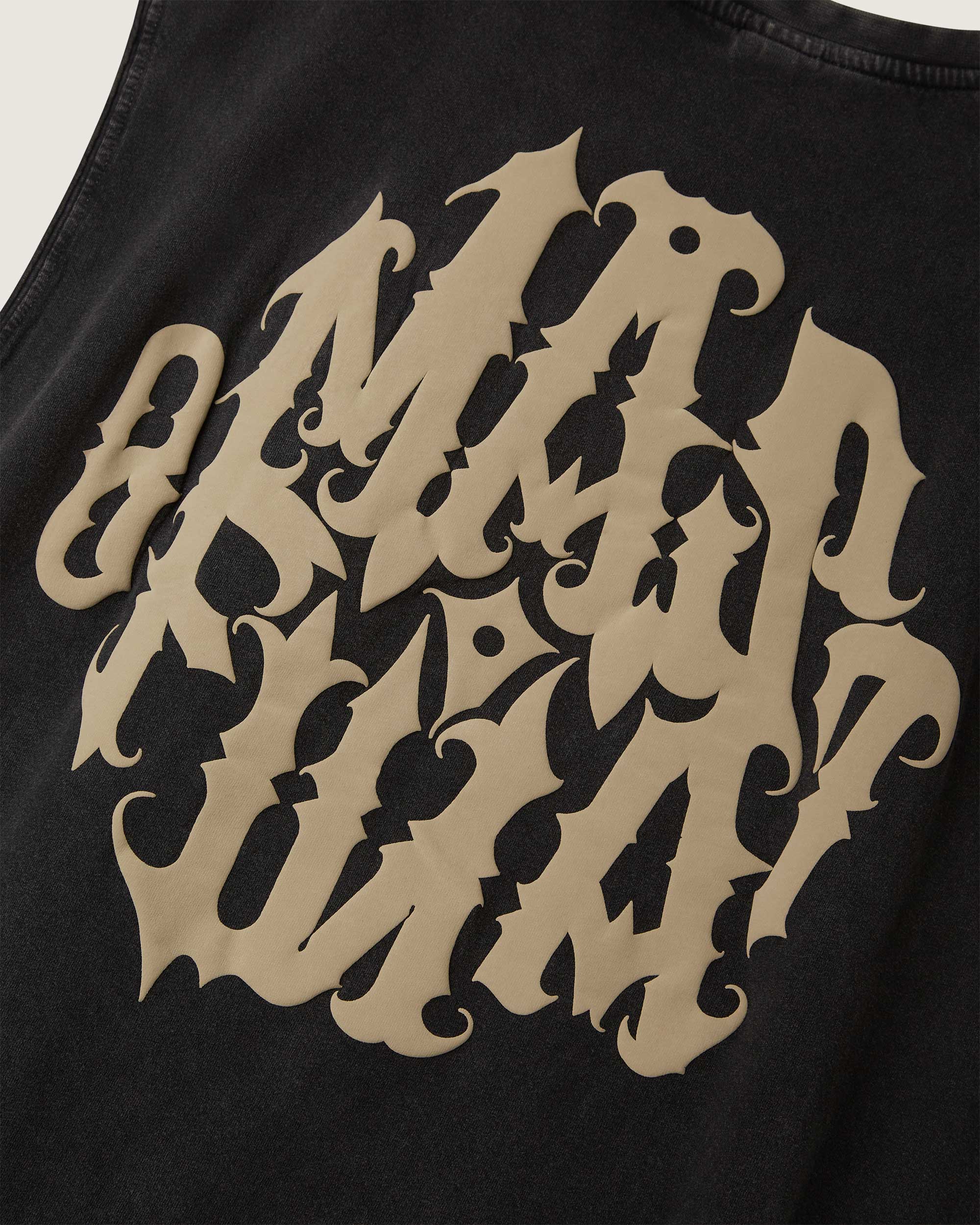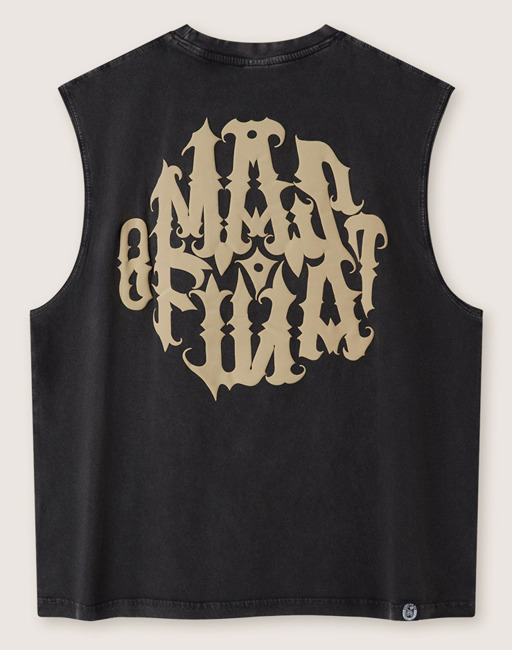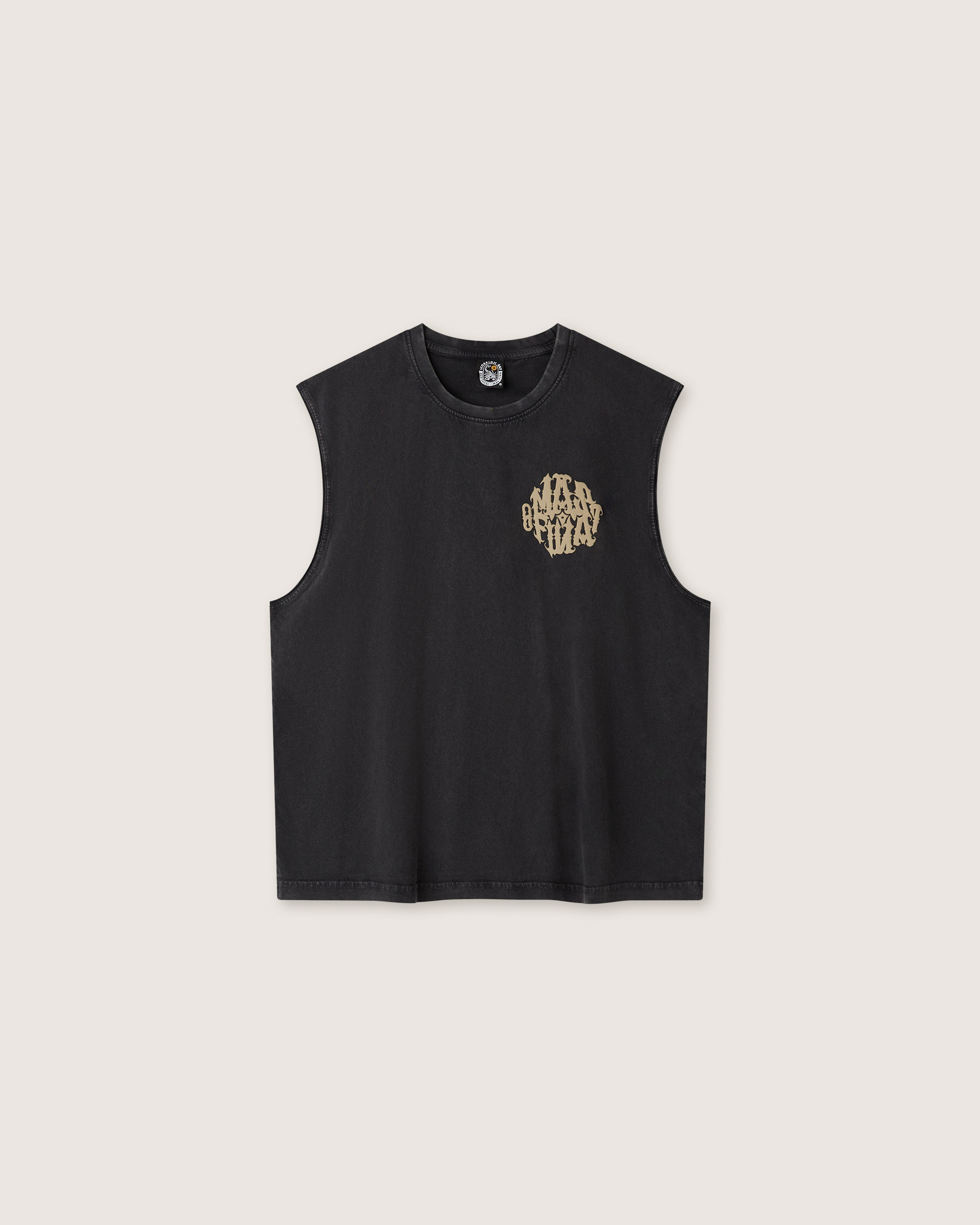 T-shirt senza maniche stampata uomo color nero. Stampa grafica lettering sul retro e a petto. Effetto vintage dato dal lavaggio.