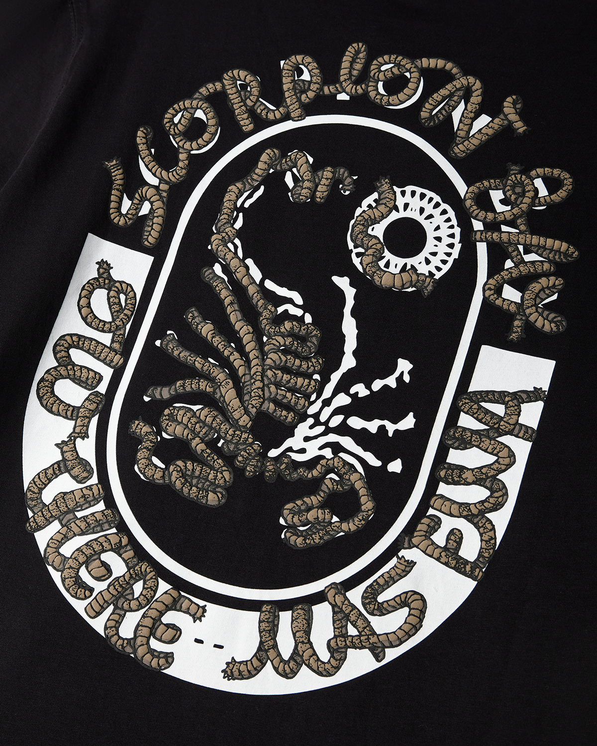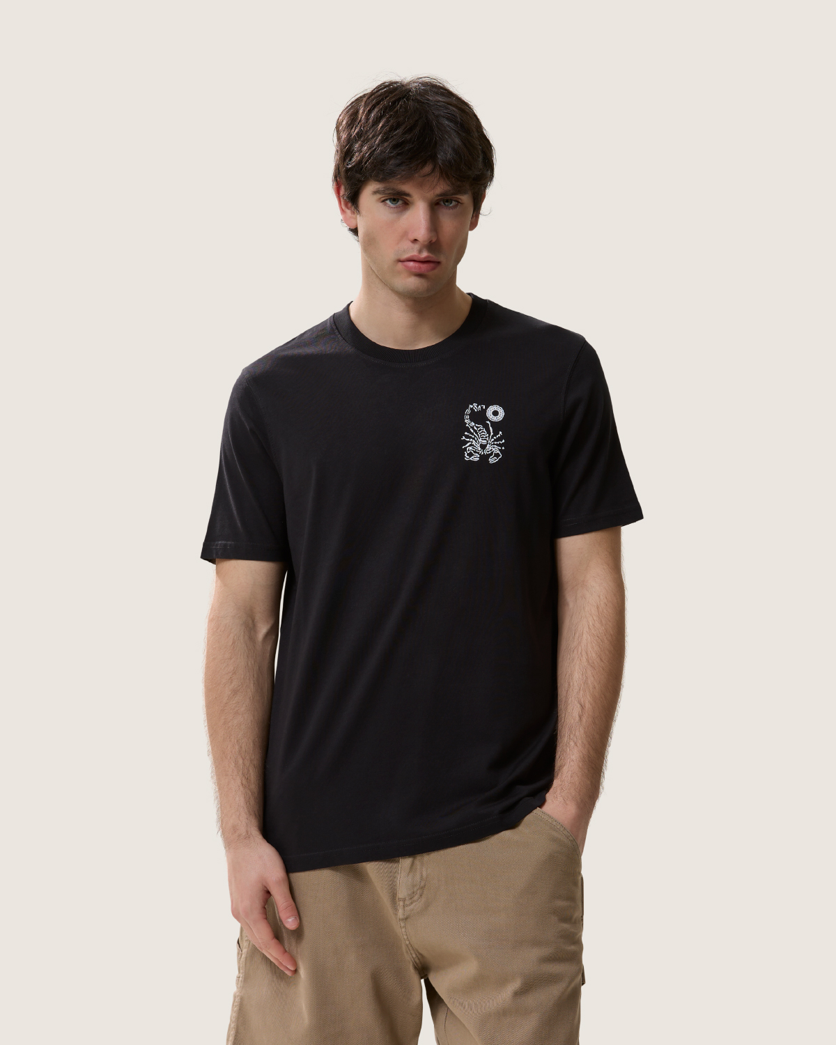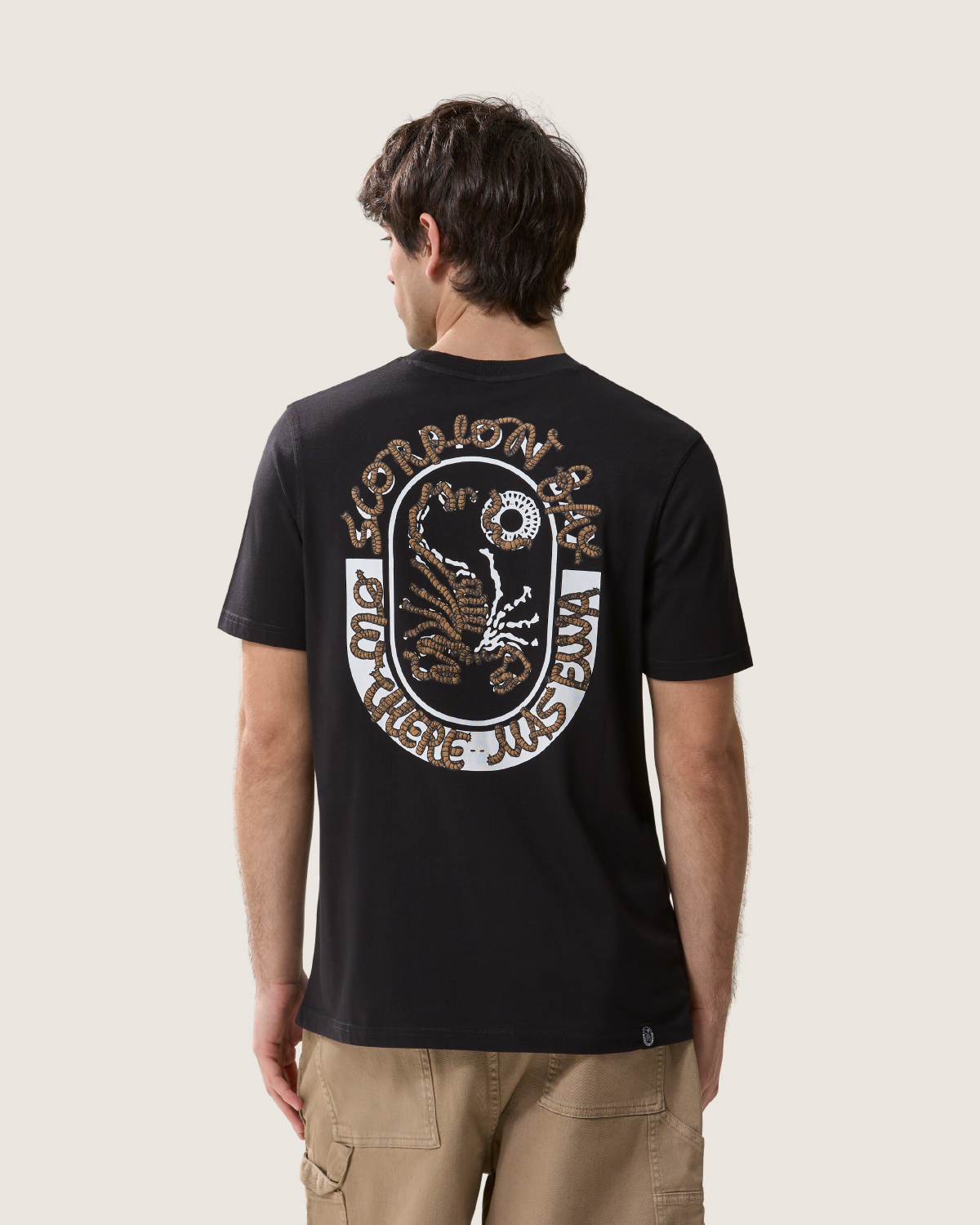 T-shirt stampata uomo color nero. Stampa grafica logo con corda intrecciata sul retro, scorpione a petto.