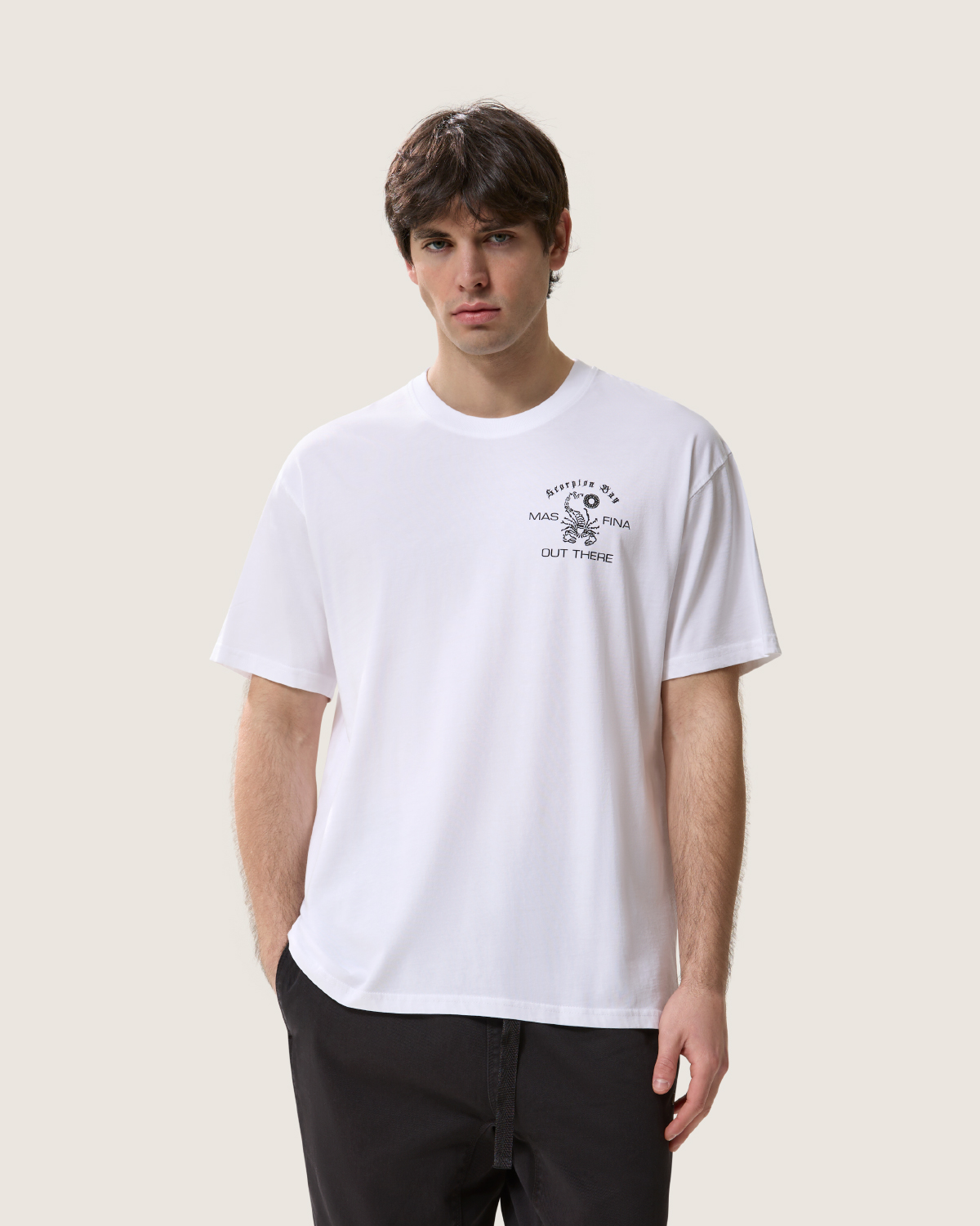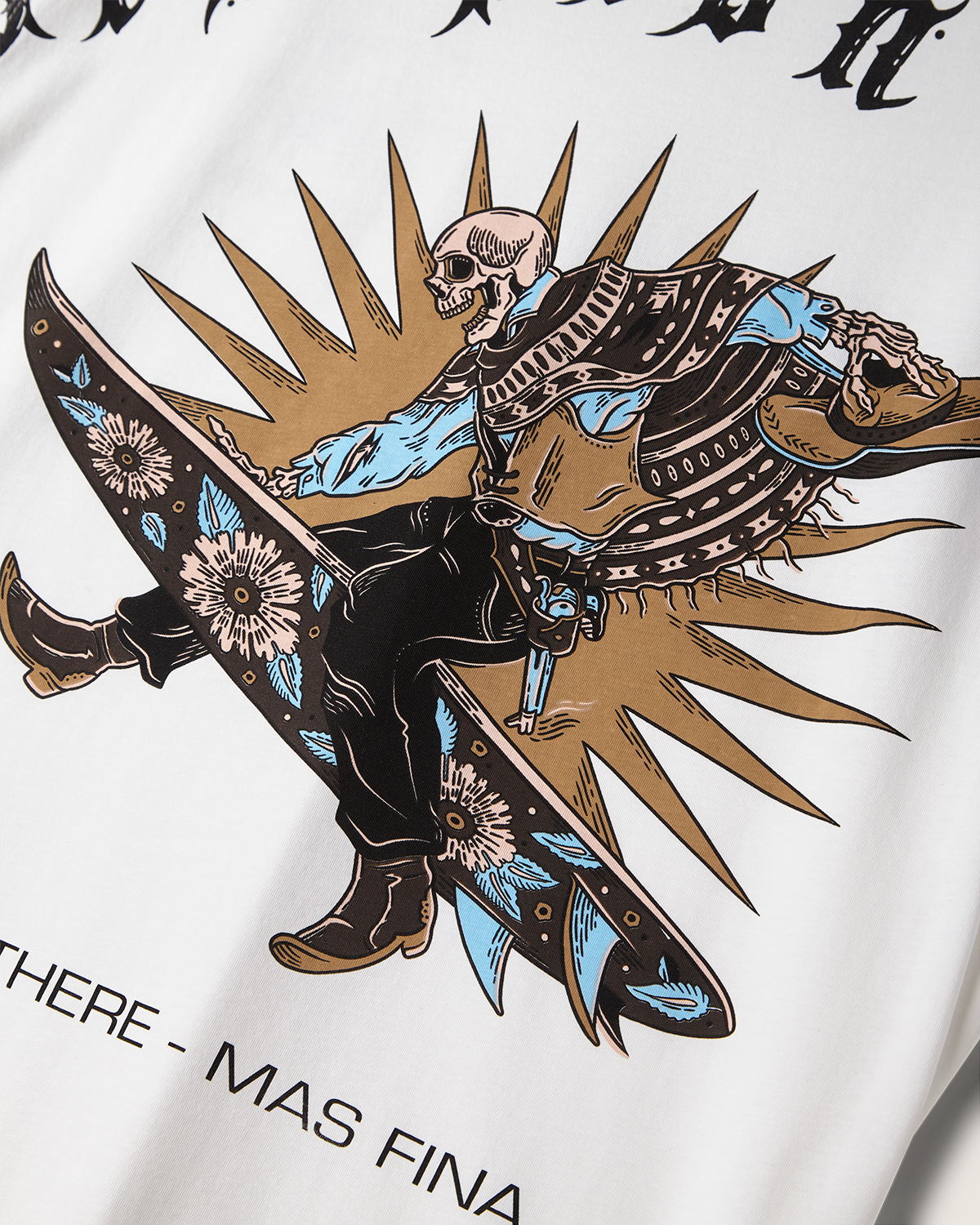 T-shirt stampata uomo color bianco. Stampa grafica cowboy skeleton su tavola da surf sul retro. Scorpione e lettering a petto.