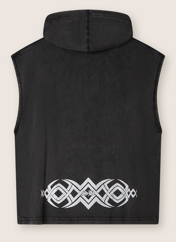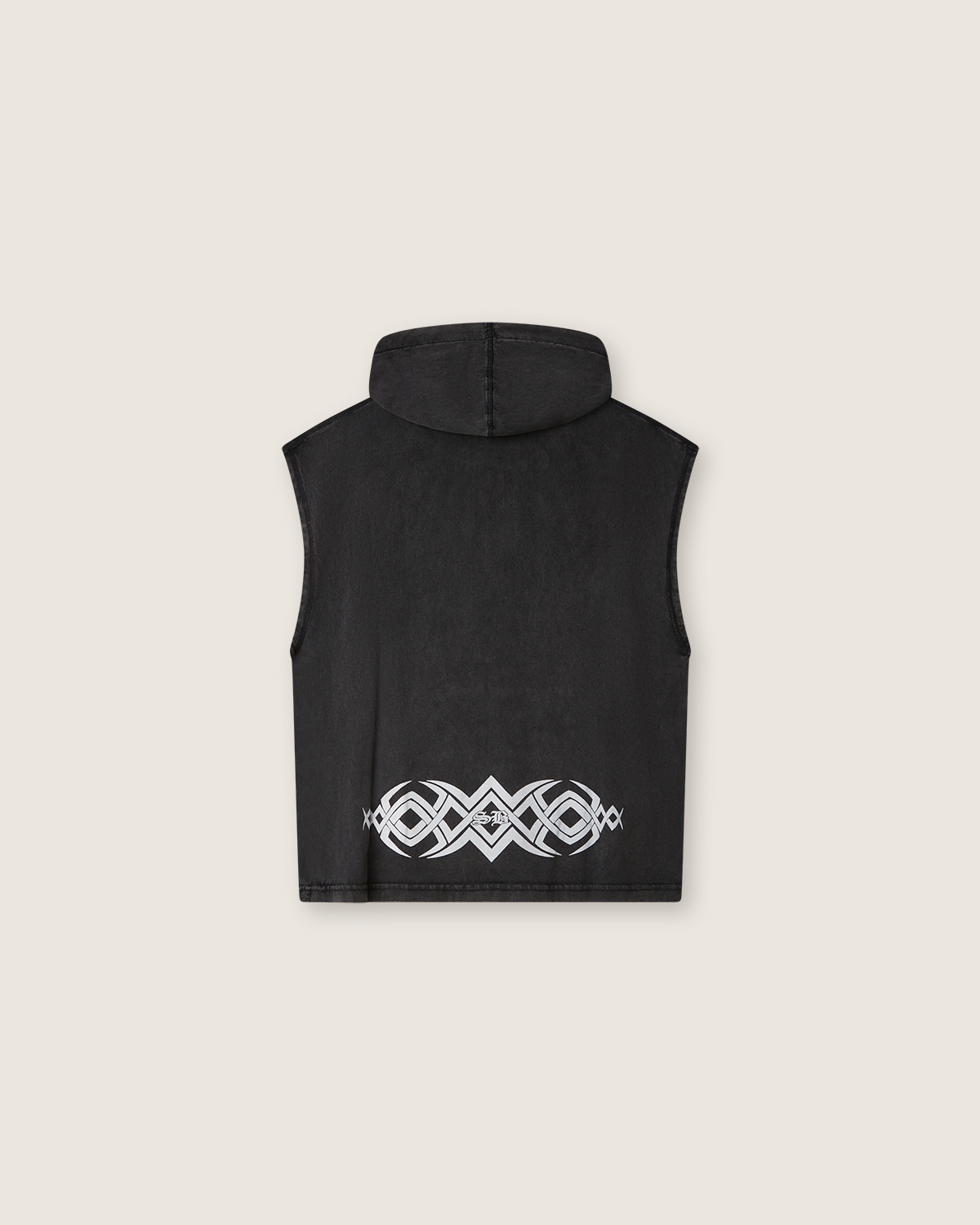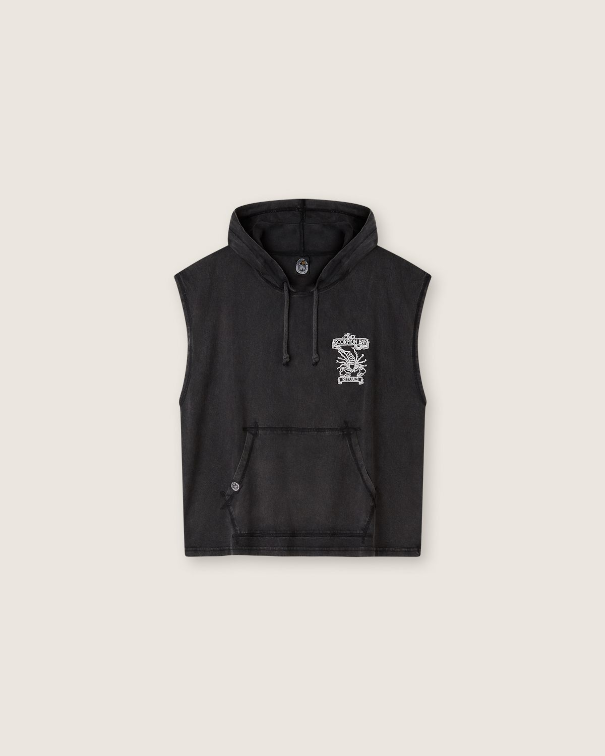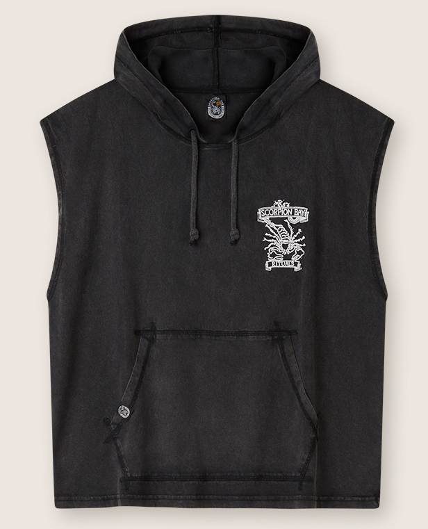 T-shirt smanicata con cappuccio uomo color nero. Vestibilità boxy. Stampa grafica d'archivio del brand sul retro e scorpione a petto. Effetto vintage dato dal lavaggio.