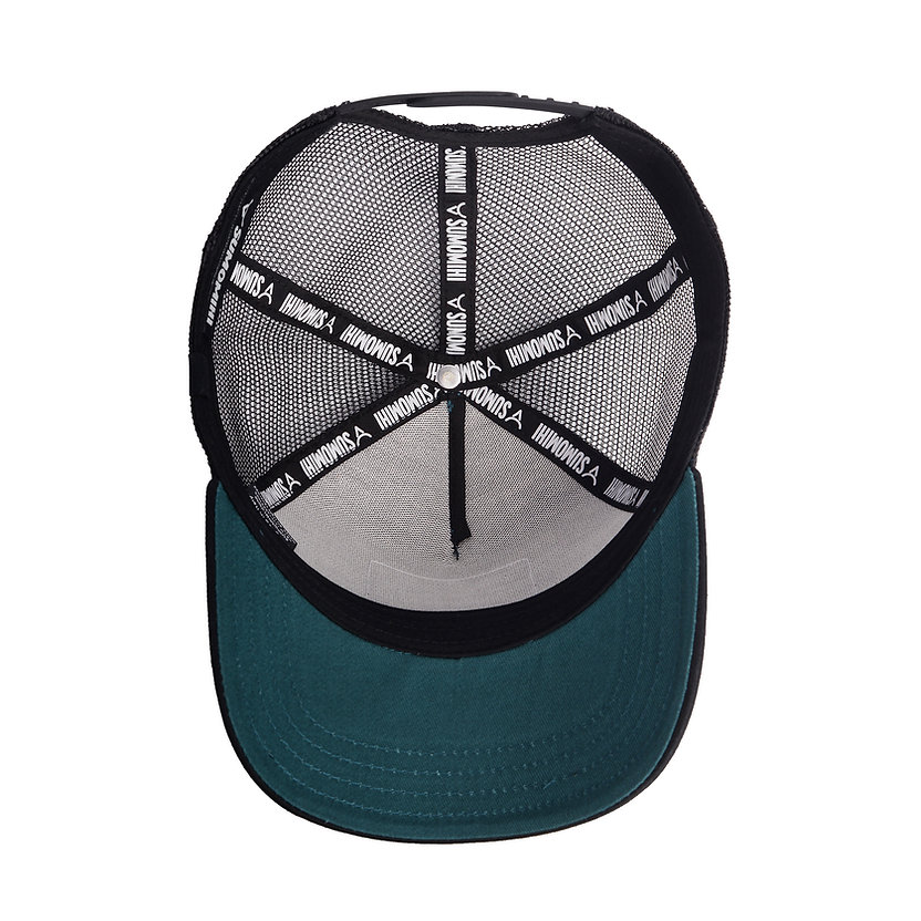 Cappello trucker a 5 pannelli, visiera e pannello frontale in cotone, pannelli laterali e posteriori in mesh di alta qualità.