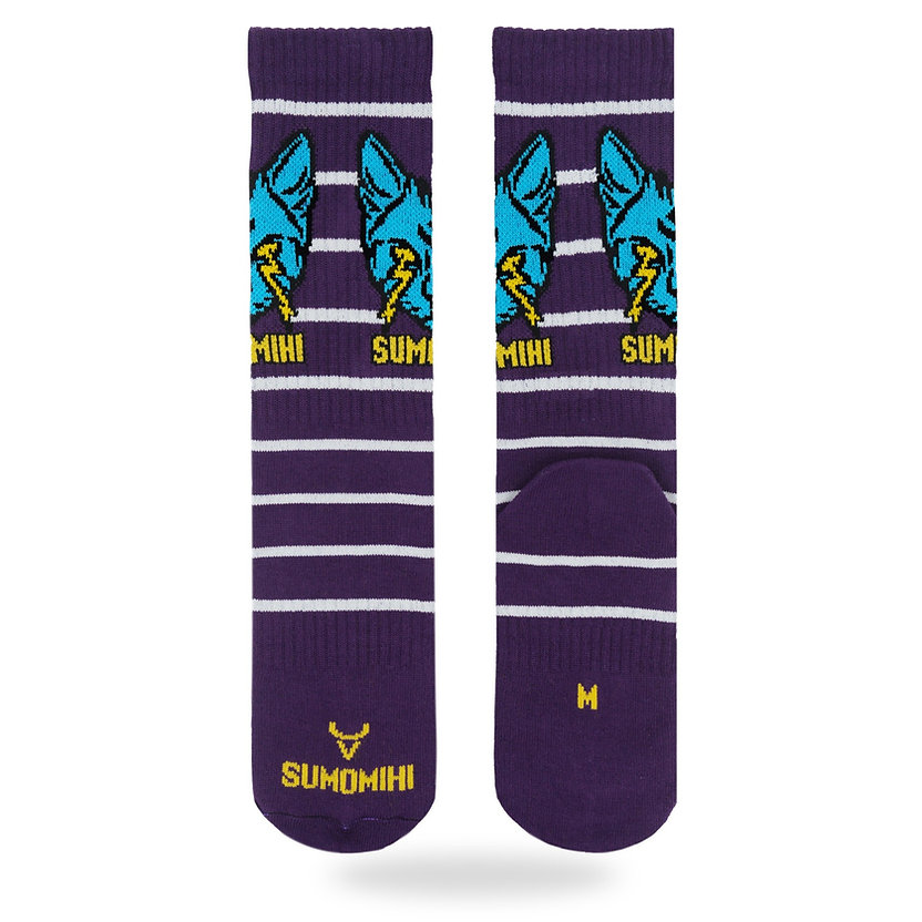 Calzini SUMOMIHI media lunghezza in morbido cotone. Colore viola, gatto alchemico laterale, tessitura Jacquard.