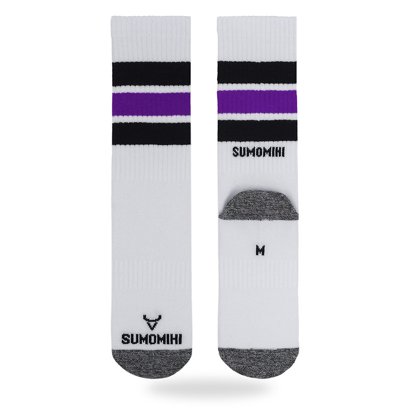 Calzini SUMOMIHI media lunghezza in morbido cotone. Colore bianco, righe grandi nere e viola. Made in Italy