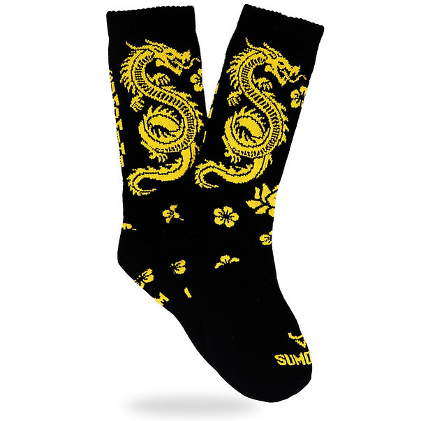 Calzini SUMOMIHI, media lunghezza in morbido cotone. Colore nero, drago giapponese colore giallo oro su ambo i lati, scritta "SUMOMIHI" posteriore e decorazioni floreali, tessitura Jacquard. Made in Italy