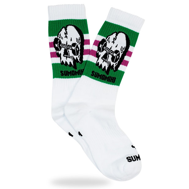 Calzini SUMOMIHI media lunghezza in morbido cotone. Colore bianco, bande verdi e fucsia con teschio-skate laterale, tessitura Jacquard. Made in Italy