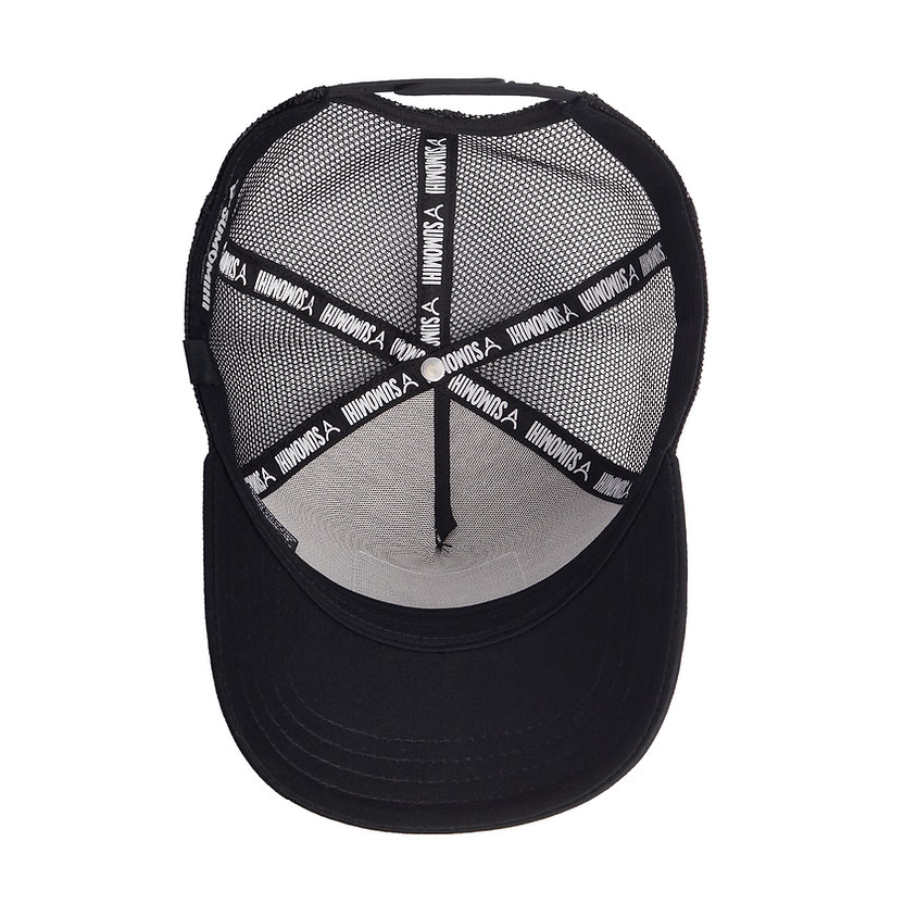 Cappello trucker a 5 pannelli, visiera e pannello frontale in cotone, pannelli laterali e posteriori in mesh di alta qualità.