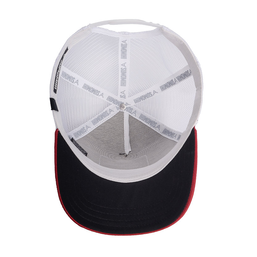 Cappello trucker a 5 pannelli, visiera e pannello frontale in cotone, pannelli laterali e posteriori in mesh di alta qualità.